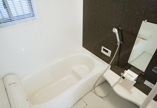 足を伸ばしての入浴後は半身浴で少し休憩。ホテルライクなゴージャスな浴室です。
