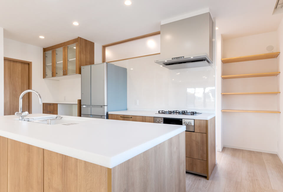 パントリーをキッチンの裏に作る事で収納を増やし、LDKがすっきりとした印象に。